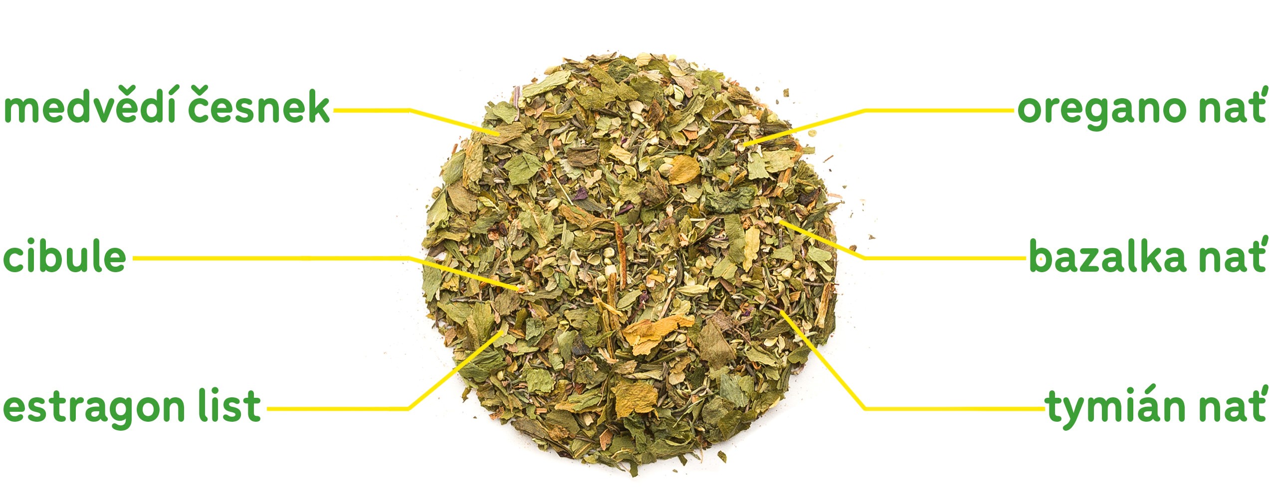 Složení: medvědí česnek nať, bazalka nať, tymián nať, oregano nať, cibule, estragon list