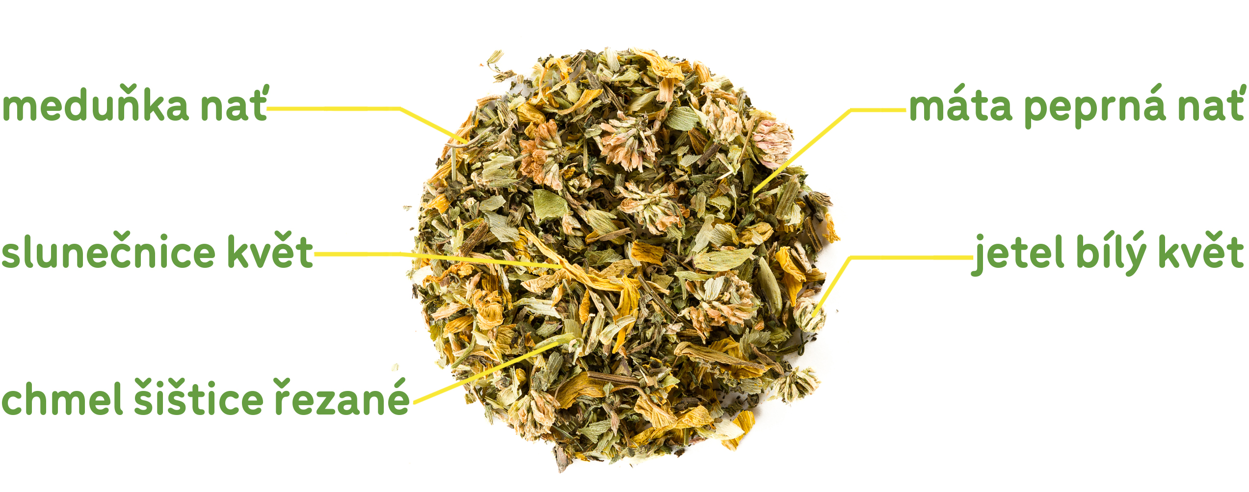 Složení: meduňka nať, máta peprná nať, slunečnice květ, jetel bílý květ, chmel šištice řezané
